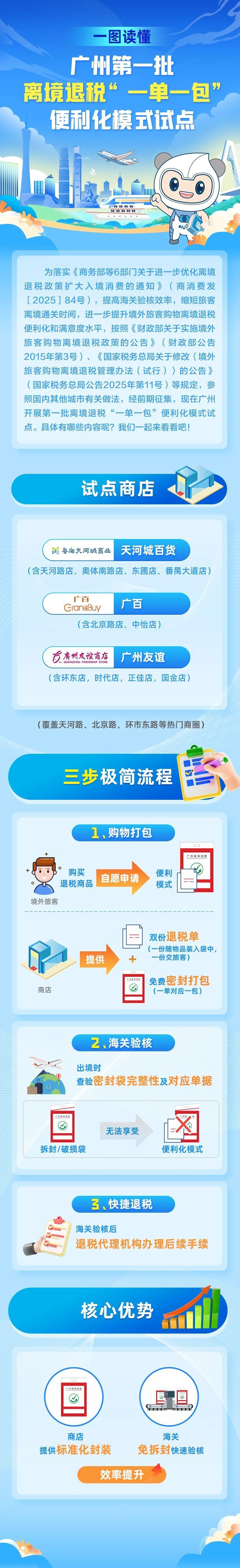广州市广百股份有限公司北京路分公司相关负责人介绍:“广百百货作为此次离境退税‘一单一包’便利化模式试点商店之一,税务部门提供了一对一的政策辅导,让我们有信心做好试点工作,为其它商店提供宝贵的经验,共同致力提升全市离境退税的吸引力。”